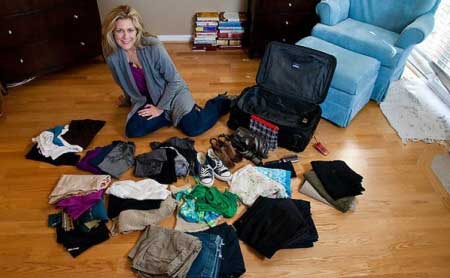 美国洛杉矶空姐 Heather Poole 是一名打包达人,她演示了如何在一个行李箱内装入十天内全部要穿的衣服。Poole所要装下的衣物包括:三条短裤,三条正装长裤,一条裙子,三条休闲裤(或牛仔裤),三件睡衣,三件泳衣,一件布裙,三件轻毛衫,四件连衣裙,十件休闲衫,六件正装衬衫,一个手包,化妆品若干和两双鞋。
