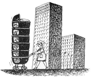 Basically, what we see in this cartoon is a woman pushing six floors of baby cradles on an urban street against the background of two skyscrapers. The piled-up cradles interestingly echo the huge buildings with tens of floors: the cradles are occupied by babies while we can imagine those buildings are filled with crowds of adults.