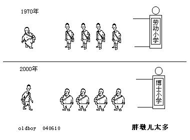 这幅漫画刻画了在1970年和2000年同一所小学的两代学生之间的鲜明对比。在1970年,这个名为“劳动小学”的学校中,大部分学生都非常瘦,相比之下只有一个胖小子。但是在2000年,学校更名为“博士小学”,大多数学生都是胖胖的身材。