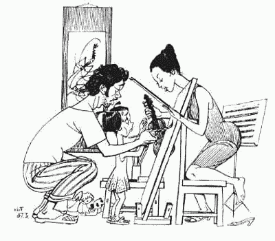 What is delineated in front of us is a pair of parents who are eager to cultivate their little child into a well-rounded person. The poor girl seems to have a quite tight schedule, as her father is teaching her how to paint while her mother is preparing for her violin class. The dullness of the kid’s eyes portrays her unwillingness and dislike to learn so many things after school.