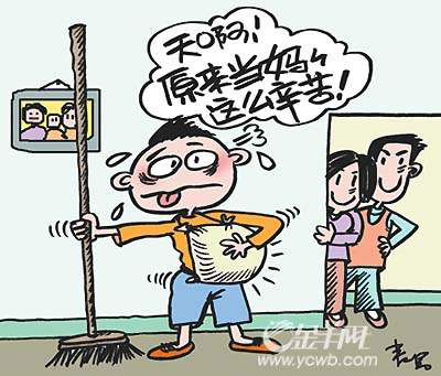 这幅图描绘了一个男孩刚刚做完了家务活,而这些活本来都应该是他母亲做的。男孩满身是汗,看上去很累,他不由地感叹道原来当妈妈如此不容易。与此同时,他的父母正悄悄躲在门后面观察着他,他们露出了满意的笑容。