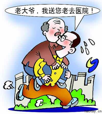 As is shown in the picture above, an old man is seriously sick on the back of a young man who volunteers to send him to the hospital. The young guy is running and sweating, saying that “Grandpa, let me take you to the hospital”. From his words we can surmise that the two people barely know each other.