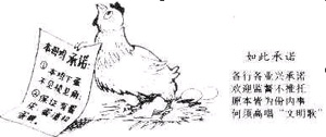 The hen mirrors a phenomenon that permeates our society, that is, businesses utilize the basic features of their products and services as the selling points for their advertisement campaigns. These “beautiful promises” tend to shape a false impression in the consumers’ mind that the products and services are of extraordinary characteristics. In this sense, the promise of one’s own responsibility is like a method of cheating, and is quite against professional morals, although there is no evidence of dishonesty if the words are examined literally.