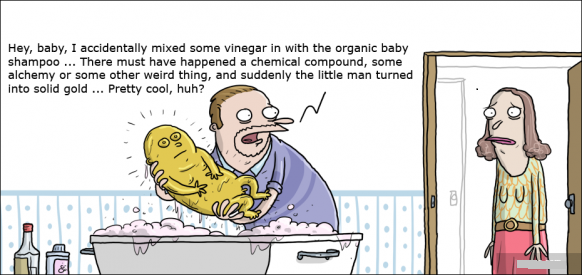 hey, baby,i accidentally mixed some vinegar in with the organic baby shampoo...there must have happened a chemical compound, some alchemy or some other weird thing, and suddenly the little man turned into solid gold.. pretty coo,huh?