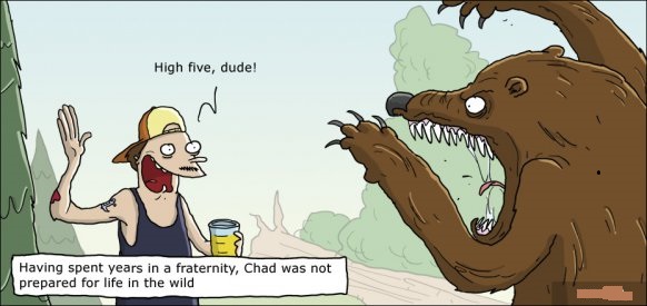 having spent years in a fraternity, chad was not prepared for life in the wild