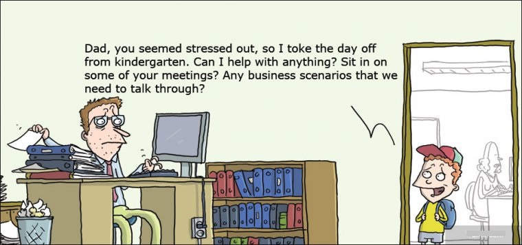 Dad, you seemed stressed out, so I toke the day off from kindergarten. Can I help with anything? Sit in on some of your meetings? Any business scenarios that we need to talk through?