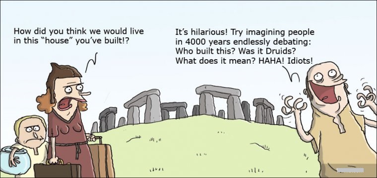 It's hilarious! Try imagining people in 4000 years endlessly debating: Who built this? Was it Druids? What does it mean? HAHA! Idiots!