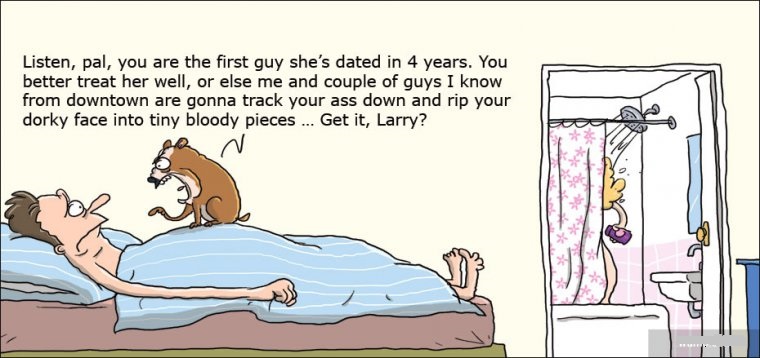 Listen, pal, you are the first guy she's dated in 4 years. You better treat her well, or else me and couple of guys I know from downtown are gonna trak your ass down and rip your dorky face into tiny bloody pieces ... Get it,Larry?
