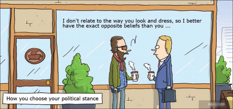 I don't relate to the way you look and dress, so I better have the exact opposite beliefs than you...