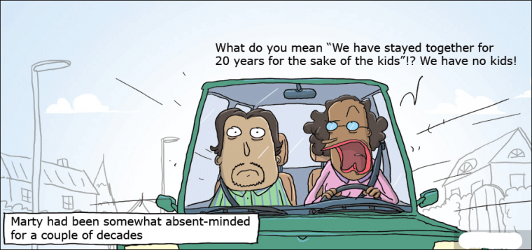 What do you mean "We have stayed together for 20 years for the sake of the kids"!? We have no kids!