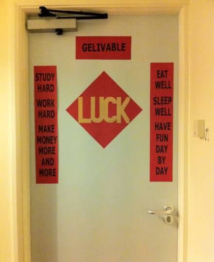 这副春联上下联各有9个英文单词、4个词组,按中国春联的格式竖排。门右侧的上联是“Eat Well Sleep Well Have Fun Day by Day”(意思是“吃得不错、睡得不错、天天都开心”),门左侧的下联是“Study Hard Work Hard Make Money More and More”(意思是“努力学习、努力工作、钱越挣越多”)。门上方的横批则是去年由中国网民创造的新英文单词“Gelivable”(意思是“给力”)。门中间还贴着一张菱形的大红纸,上面印着金色大字“LUCK”(意思是“好运”)。