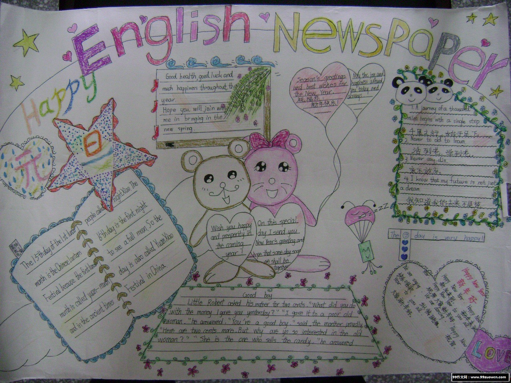 学生通过主动合作、精心设计,绘制出了一幅幅图文并茂、生动有趣的英语小报。在这些作品中,有的以内容丰富充实、书写规范整齐取胜;有的以版式设计美观大方、图文并茂见长。 此次活动,既丰富了师生的课余文化生活,增强了广大学生学习英语的兴趣,又培养了学生动手操作的能力,为新年的到来增添了乐趣。