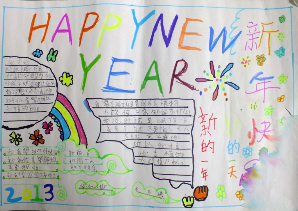春节英语手抄报图片-快乐的新年——小朋友,大家现在从幼儿园开始,就在学习英语了,大家喜欢英语这门学科吗?其实学英语最重要的就是要培养对它的兴趣爱好,要学会去爱上这门学科。在英语课上,我们不仅能够学习到新的语言知识而且还可以了解到很多外国的文化习俗,下面就欣赏一下这幅学英语的手抄报吧。
